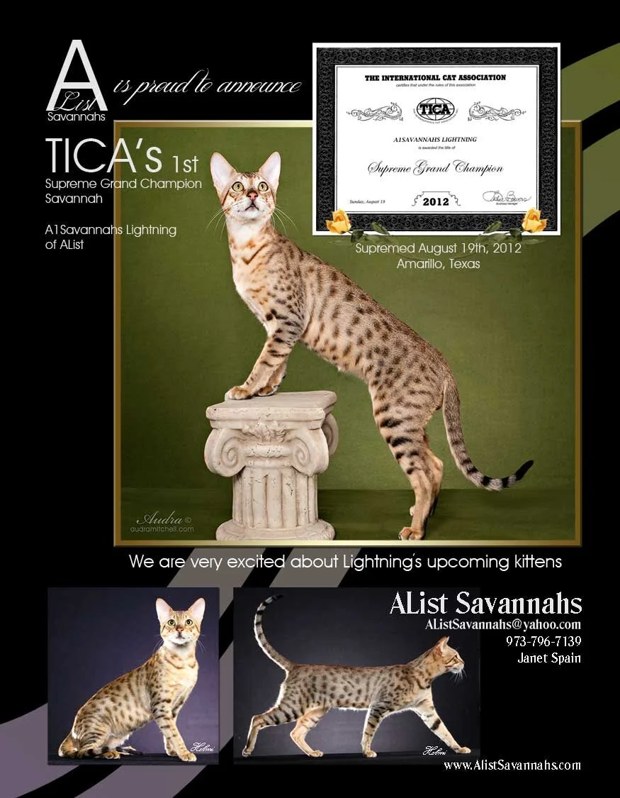 —2012 A1Savannahs “Lightening” of AList Savannahs owned by Janet Spain Rohrbaugh became TICA’s first Supreme Grand Champion cat.